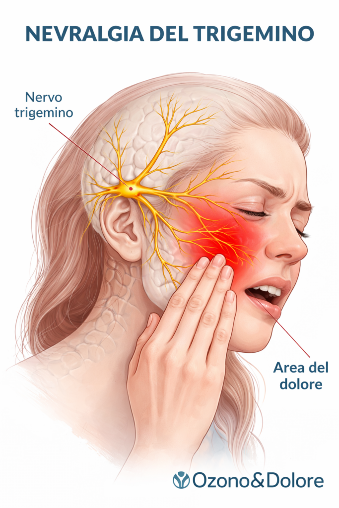 Il dolore origina dal nervo trigemino, il principale nervo sensitivo del volto, responsabile della sensibilità di fronte, occhi, guance, mascella e mandibola.